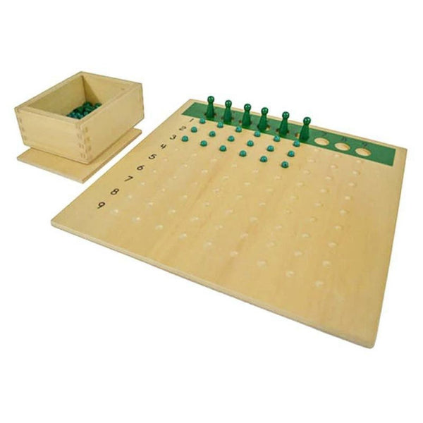 Tabuleiro de divisão de madeira com 81 pérolas verdes e 9 pinos verdes numa caixa de madeira.
